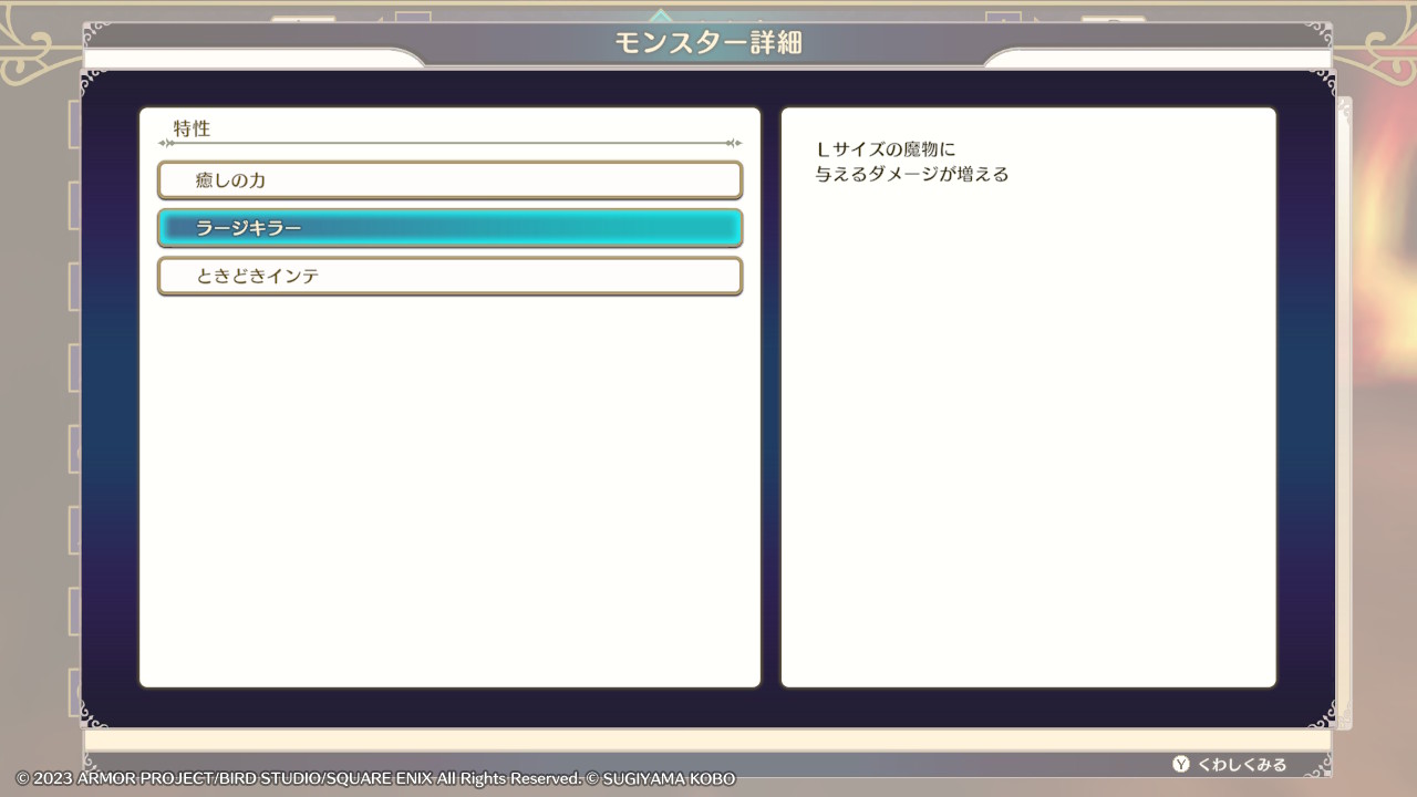 ラージキラーの効果は、Lサイズの魔物に与えるダメージが増えます。