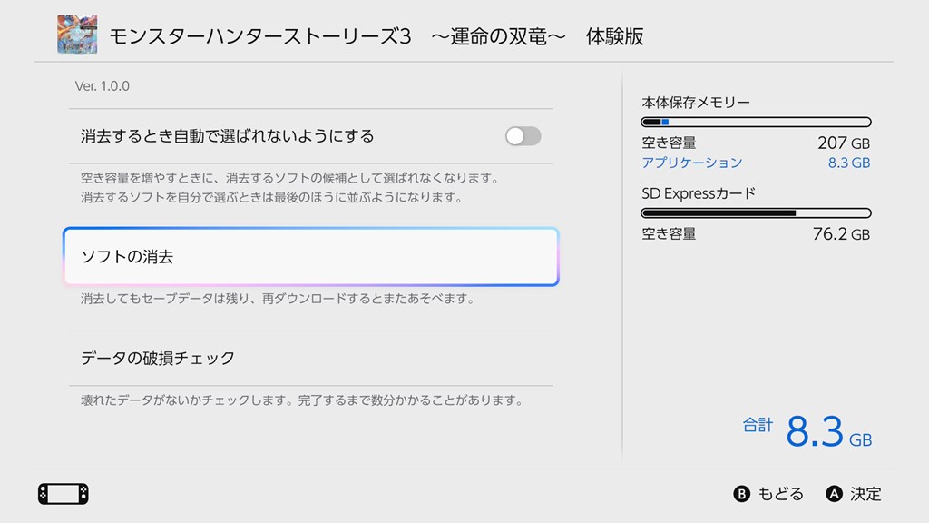 ここでは「モンスターハンターストーリーズ3」の体験版のデータを選んでいます。